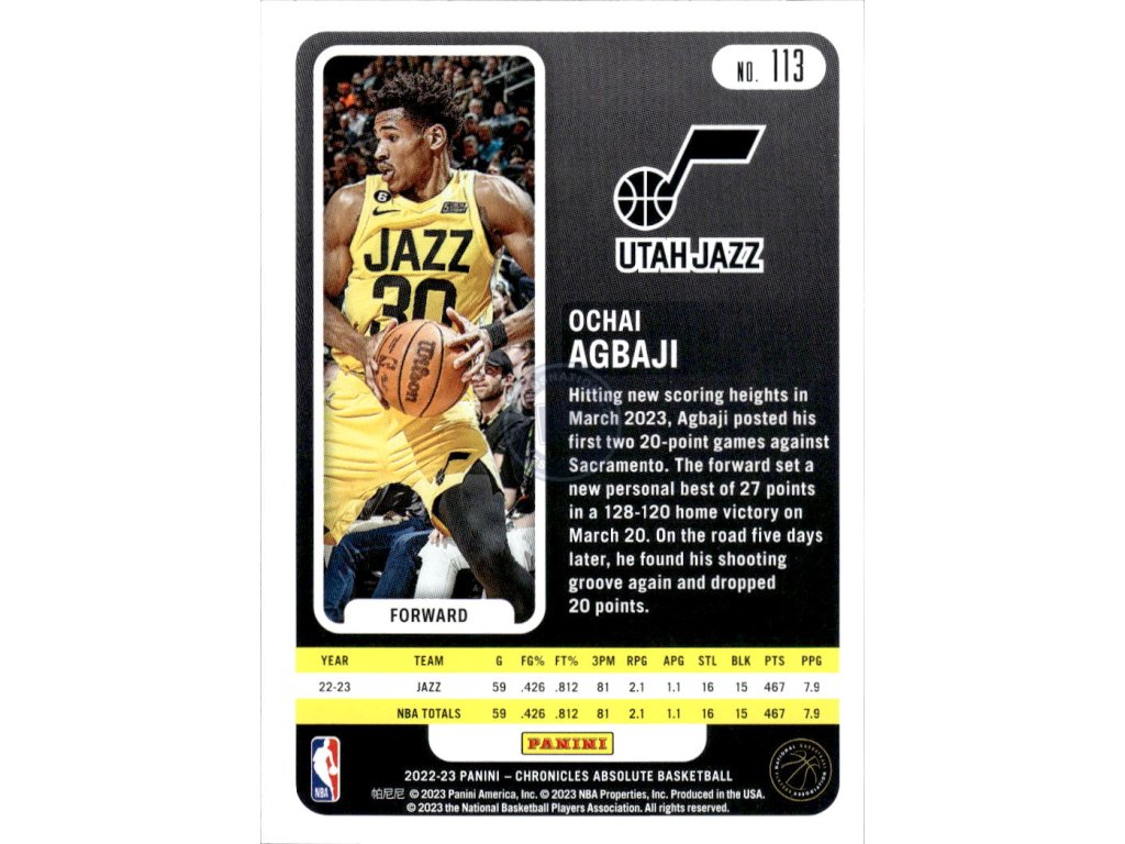 NBA kartička Panini Chronicles Ochai Agbaji Utah Jazz Base Absolute Memorabilia.