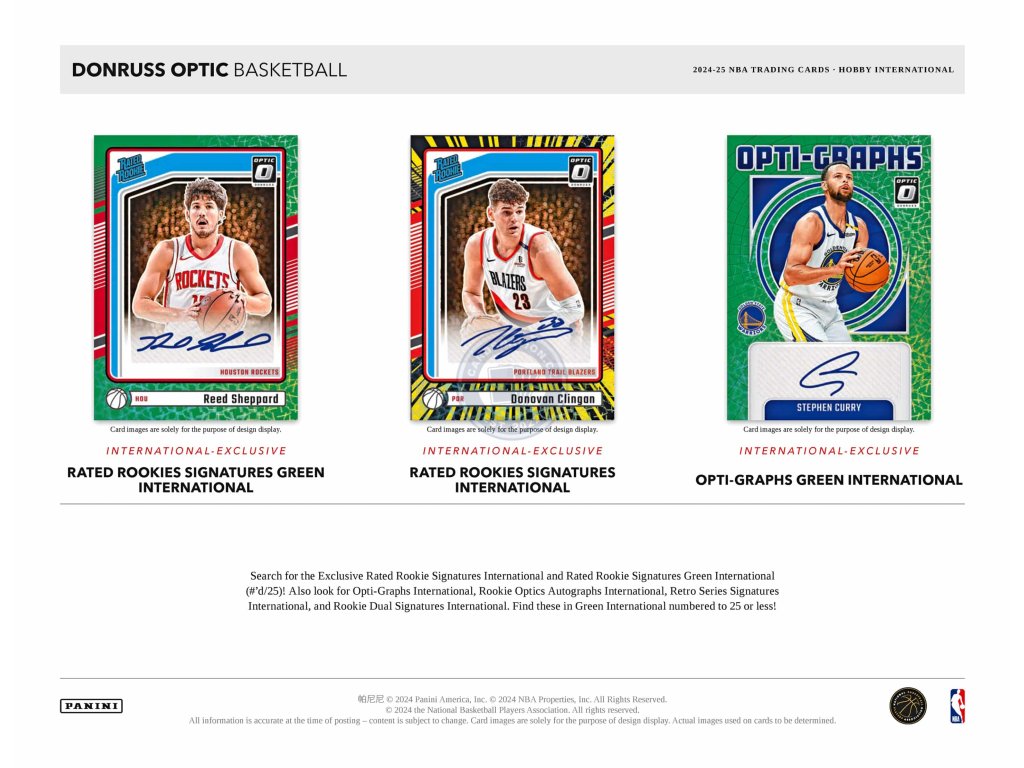 Můžete najít podpisové karty Opti-Graphs International, Rookie Optics Autographs International, Retro Series Signatures International a Rookie Dual Signatures International. Podpisové karty také v parelalních verzích Green v limitech #/25 a méně
