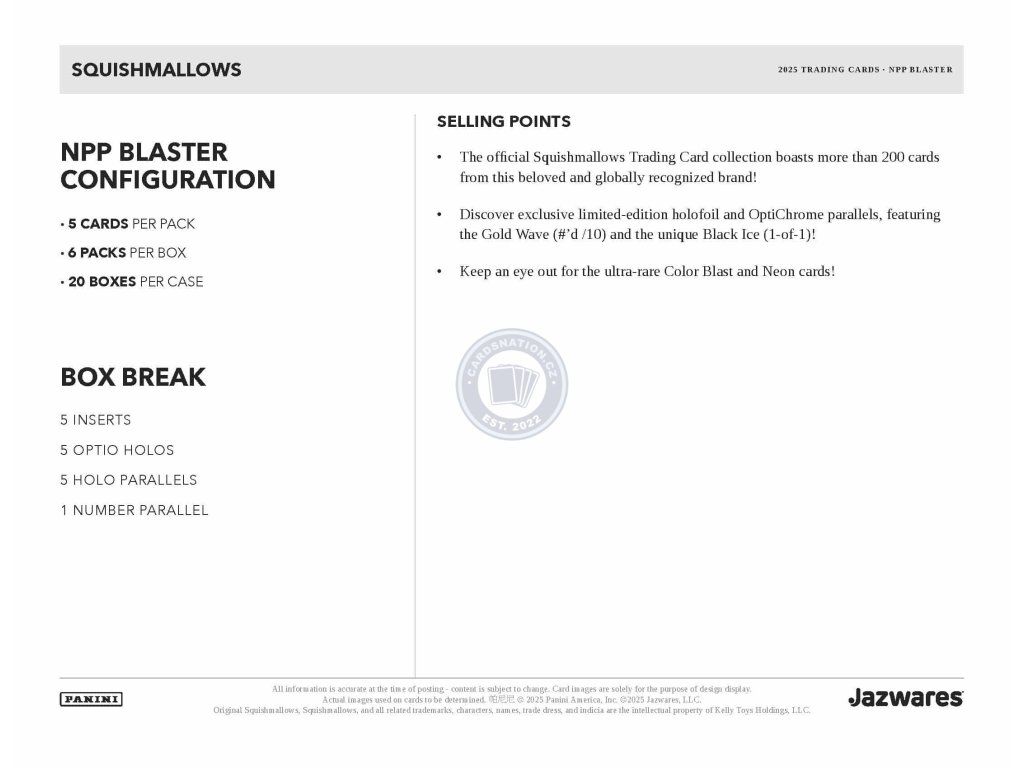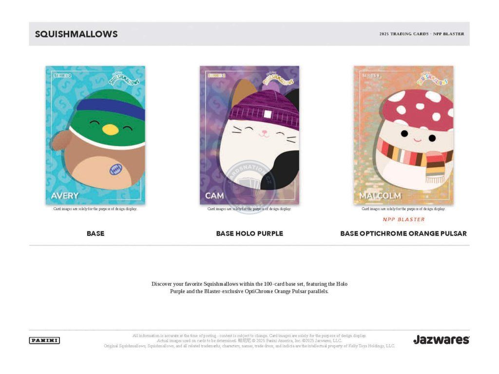 Základem je 100karetní base set, ve kterém najdete své oblíbené Squishmallows doplněné o atraktivní paralelní verze jako Holo Purple, exkluzivní OptiChrome Orange Pulsar (pouze v Blaster boxech) nebo OptiChrome White Mojo (exkluzivně v Mega boxech).