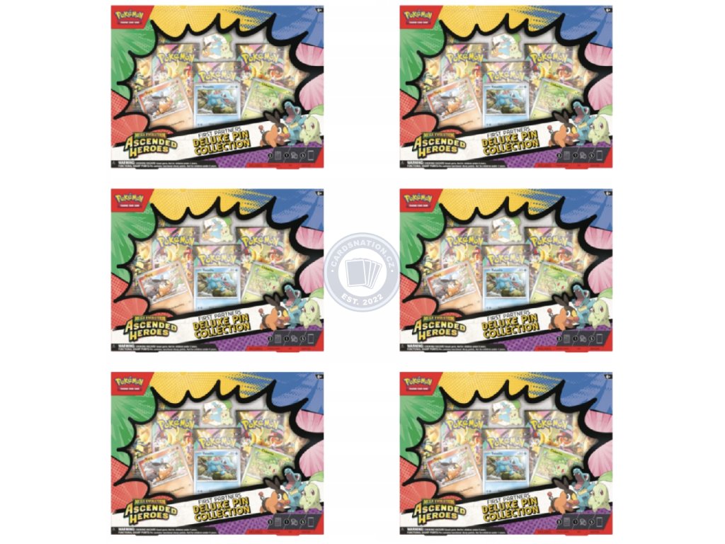 Pokémon TCG: ME02.5 - First Partner Deluxe Pin CollectIion obsahuje 5 balíčků Pokémon karet z edice Ascend Heroes. Každý balíček obsahuje 10 karet. Celkově tak získáte 50 karet + 1 odznak + 3 promo karty.