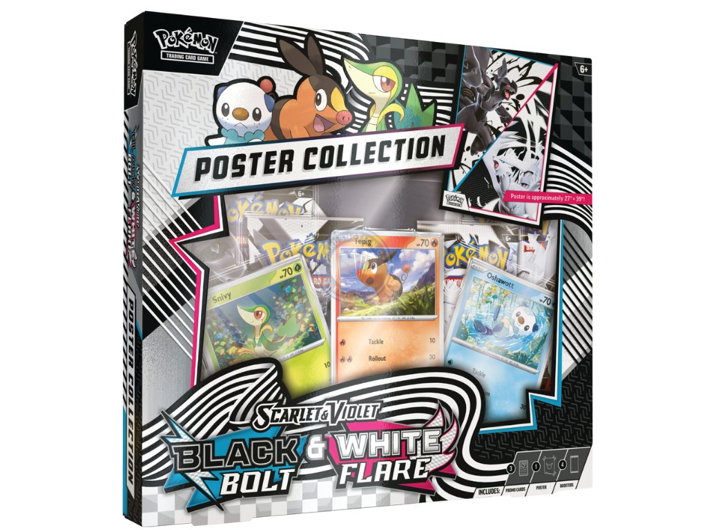 Poster collection obsahuje 3 foilové promo karty Snivy, Tepig a Oshawott, 4 booster balíčky a oboustranný plakát.